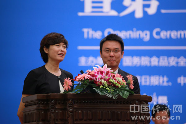 食品安全宣传周形象大使、著名主持人敬一丹和张羽代表“全国食品安全宣传周”标识征集活动主办方宣布中标作品及作者。 摄影/记者 王维亮