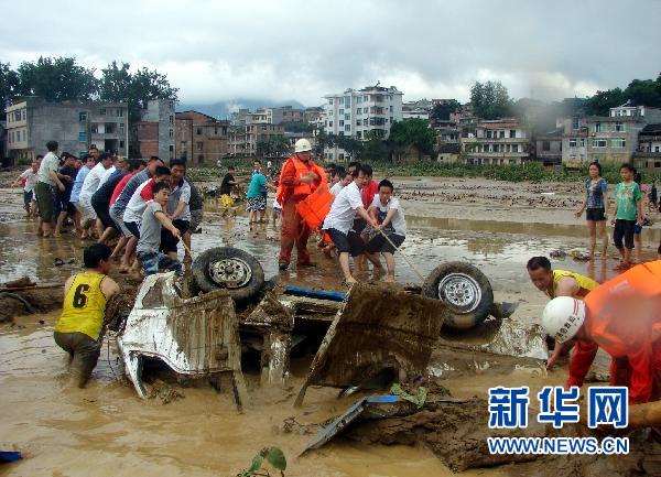 资料图片:6月6日,在受灾严重的望谟县,消防官兵与群众联手抢险。 新华社发(罗祖亮 摄)