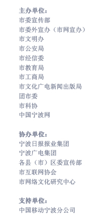 组织机构: 支持单位:国新办网络局 主办单位:浙江省委外宣办(网宣办).宁波市委宣传部 协办单位:浙江省网络文化协会.宁波市委外宣办(网宣办) 承办单位:中国宁波网 时间:2011年6月16日9:30 — 17:00
