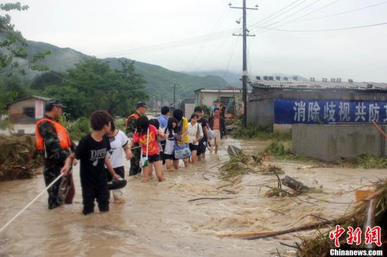 6月9日晚8时起,湖北咸宁各地开始普降暴雨,降雨量超过200毫米。其中通城、崇阳、赤壁三地受灾最为严重。多地爆发山洪、泥石流灾害,造成道路被毁、群众被困,当地消防部队紧急出动,截至10日14时,共营救被困群众140余人,疏散人员1300余人,打捞遇难者遗体2具。图为消防官兵及时疏散被困群众。中新社发惠斌 摄