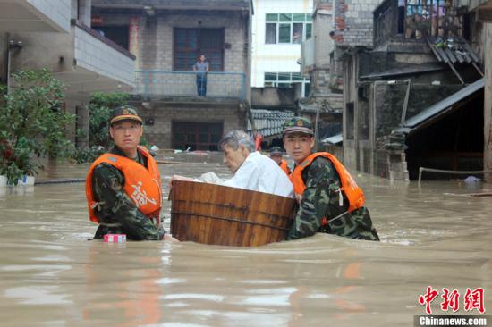 6月9日晚8时起,湖北咸宁各地开始普降暴雨,降雨量超过200毫米。其中通城、崇阳、赤壁三地受灾最为严重。多地爆发山洪、泥石流灾害,造成道路被毁、群众被困,当地消防部队紧急出动,截至10日14时,共营救被困群众140余人,疏散人员1300余人,打捞遇难者遗体2具。图为消防官兵把老人用木桶送到安全地带。中新社发惠斌 摄