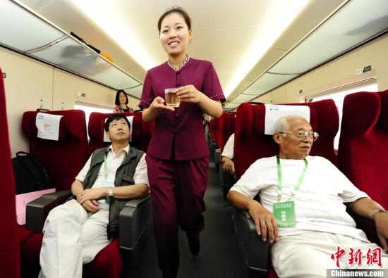6月17日上午,京沪高铁试运行情况向媒体开放,图为高铁列车服务员为一等座车厢的“乘客”端茶送水。京沪高铁运营初期,计划每天安排开行动车组列车90对,实行时速300公里和250公里混跑模式。从北京到上海最短时间为4小时48分钟。时速300公里动车组列车从北京到上海全程票价二等座555元,一等座935元,商务座 (包括观光座、一等包座)1750元;时速250公里动车组列车全程票价二等座410元,一...