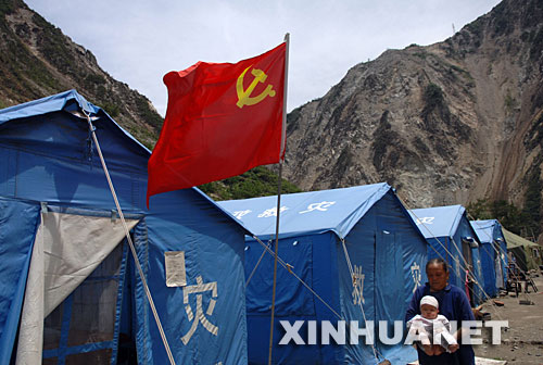 资料图片:2008年7月1日,在汶川受灾群众安置点党旗迎风飘扬。新华社记者 金良快摄