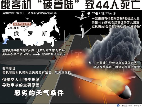 当地时间20日深夜,俄罗斯一架图-134型客机在俄西北部城市彼得罗扎沃茨克机场着陆时发生事故,客机在机场附近的公路上“硬着陆”,导致机身解体并起火,造成44人死亡、8人受伤,生还者包括一对姐弟。