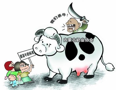 我国新的乳品安全国家标准,允许原奶细菌数最大值为每毫升200万个,而此前的标准是50万个,欧美标准在10万个左右。这个被称作“一夜之间倒退了25年的标准,也是全世界最低最差的一个标准”,自从去年出台以来,饱受各界炮轰,然而岿然屹立,毫无动摇征象。理由相当坚挺,说是“为了保护中小奶农的利益”。内蒙古奶业协会秘书长那达木德称:若执行更高标准,七成奶农将杀牛。(6月22日《人民日报》)