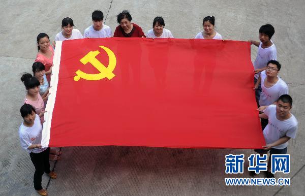 6月23日,湖南工艺美术职业学院的师生在展示湘绣党旗。当日,一幅长288厘米,宽192厘米的湘绣党旗在位于湖南益阳市的湖南工艺美术职业学院湘绣艺术学院绣制完成。这面巨幅党旗从设计到封针历时一个多月,由湖南工艺美术职业学院的师生联手采用传统的平针绣法绣制而成,作为献给党的90岁生日的特殊礼物。新华社记者 李尕摄 (资料图片)