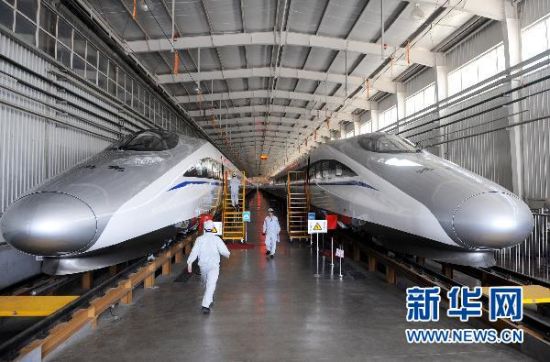 6月15日,这是两列即将交付京沪线运营的CRH380A动车组正在进行出厂前最后的静态检测。(资料图片)