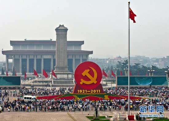 6月28日,天安门广场上的“红心向党”主题大型立体花坛吸引了众多游客。当日,天安门广场上的“红心向党”主题大型立体花坛完成。花坛直径50米,主景底座高2米,顶高15米,以党徽为主景,花坛以9颗红心图案紧紧围绕在党徽四周,表达中华儿女红心向党的坚定信念。新华社记者 张宇摄