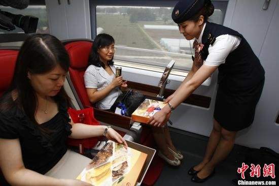 6月27日,京沪高铁试运行情况向媒体开放,数十家中外媒体的记者登上列车。图为高铁列车上的美女列车员。中新社发 富田 摄