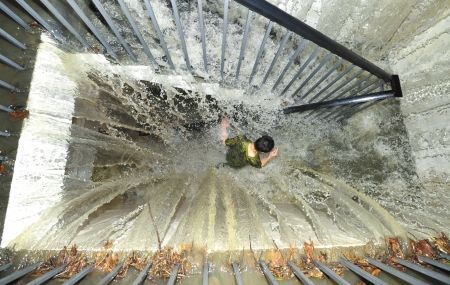 汇集的雨水灌入小天南街一地下车库内 谭曦摄