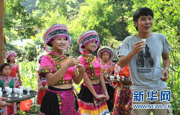 7月2日,水田乡湾子村古苗寨的苗族姑娘用美酒迎接游客。在位于云贵川三省交界处的云南省威信县,当年红军长征途经该县留下了许多遗迹。今年,当地有关部门全面修复红色故地遗迹,帮助贫困山区各族群众发展红色旅游与民族风情特色游,1至6月已接待游客超过15万人次。新华社记者 陈海宁 摄