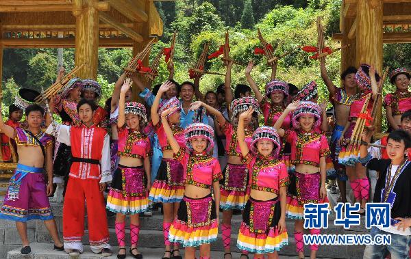 7月2日,水田乡湾子村古苗寨的苗族村民在寨口欢送游客。新华社记者 陈海宁 摄