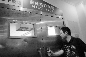 妞妞的父亲章中华在重症监护室门口向里面张望。