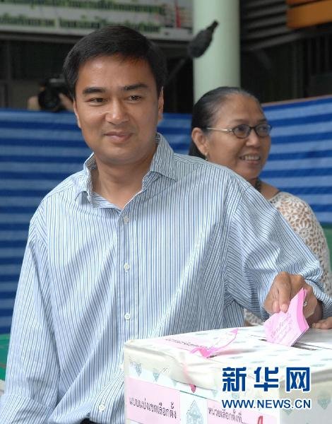 7月3日,泰国看守政府总理、民主党头号竞选人阿披实在曼谷瓦达那地区的一个投票站投票。泰国国会下议院选举当地时间当日上午8时开始投票。这是泰国近4年来举行的首次国会下议院选举,将产生国会下议院500名议员。 新华社发(拉亨摄)