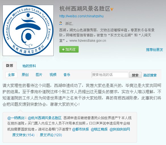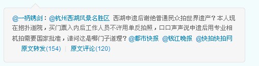 “西湖申遗后谢绝普通民众拍世界遗产?”疑惑的“一柄锈剑”在自己的微博中说,请问这是哪门子道理?微博一发,迅速被网友们转载,评论也盖到了100多楼。