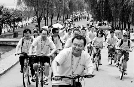 2011年6月26日,500名来自上海的环保志愿者来到杭州进行自行车环西湖骑行活动,庆祝西湖申遗成功。