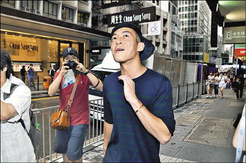 抬头获悉谢霆锋就在楼上,陈冠希一脸尴尬快闪走人(香港星岛日报供图)