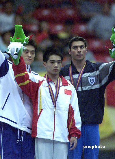 资料图:2001年8月26日,中国小将张尚武、郑李辉联手征战男子吊环单项奖牌,最终新秀张尚武夺得该项目金牌。