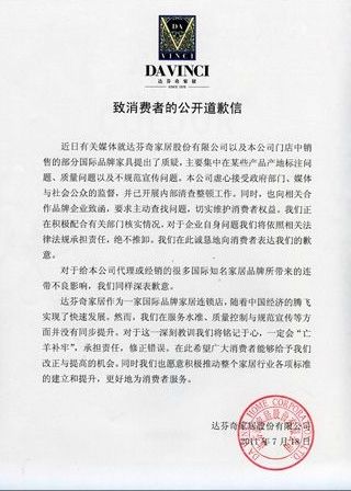 达芬奇公开道歉信只字未提赔偿被质疑缺乏诚意
