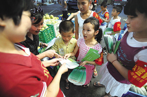昨天,一支由外来务工人员子女组成的“小小文明监督员”宣传队,活跃在江东周宿渡社区果品批发市场,他们向在此工作的家人和其他业主发放印有文明创建内容的小扇子等宣传资料,并及时劝阻乱丢垃圾等不文明行为。