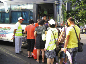 近日,陆嘉社区组织城管义工到汽车东站为民服务。图为城管义工正在提醒乘客注意上下车安全,劝导乘客有秩序上下车。