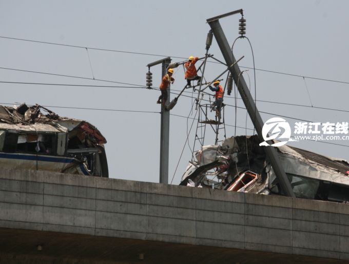 浙江在线7月24日讯(记者 王坚颖)7月23日20时27分,北京至福州的D301次列车行驶至温州市双屿路段时,与杭州开往福州的D3115次列车追尾。图为救援现场。
