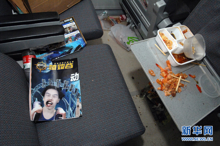 这是车厢内的旅客遗留下的一本杂志和一个餐盒(7月24日摄)。 7月24日下午,记者来到刚从铁轨上被大型吊车吊下的D3115次列车的15号车厢内,车厢的连接处严重变形,事发时列车即将驶入温州站,许多旅客正在车上吃着晚餐。23日20时30分左右,列车被由北京至福州的D301次列车追尾,一阵巨响之后,逃生的乘客们纷纷疏散至安全地带,没有吃完的晚餐餐盒散落在座位边。新华社记者 黄宗治 摄