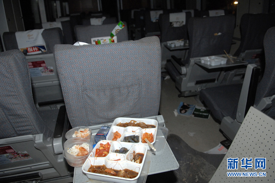 这是旅客的餐盒遗留在车厢内(7月24日摄)。 7月24日下午,记者来到刚从铁轨上被大型吊车吊下的D3115次列车的15号车厢内,车厢的连接处严重变形,事发时列车即将驶入温州站,许多旅客正在车上吃着晚餐。23日20时30分左右,列车被由北京至福州的D301次列车追尾,一阵巨响之后,逃生的乘客们纷纷疏散至安全地带,没有吃完的晚餐餐盒散落在座位边。新华社记者 黄宗治 摄