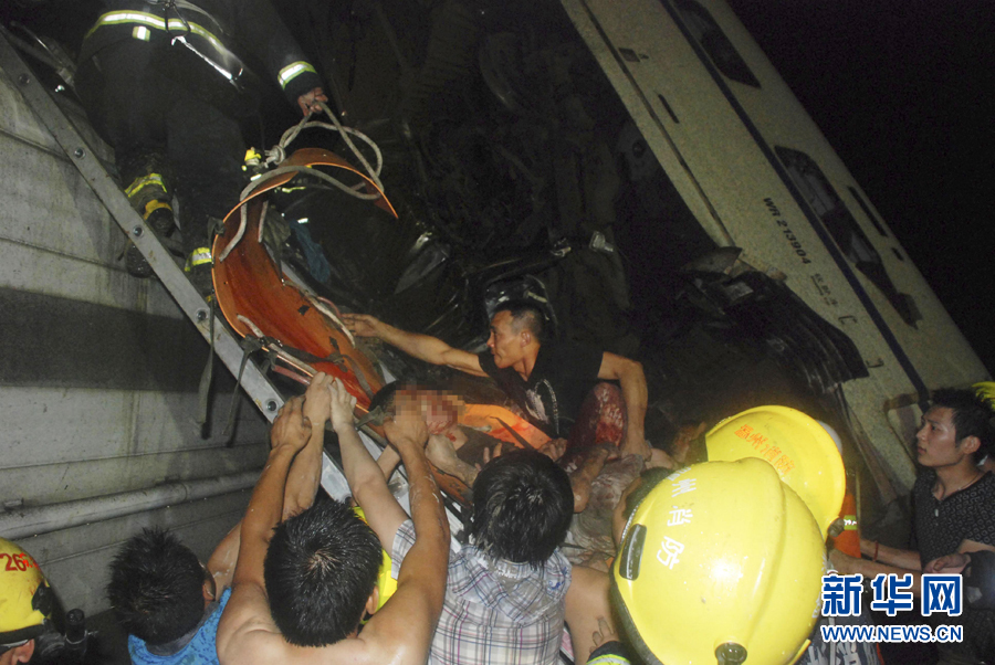 7月23日,救援人员在列车脱轨事故现场抢救伤员。当晚,在杭州往温州方向双屿路段下岙路,动车D3115次车厢脱轨掉落桥下。 新华社发(余根铃 摄)