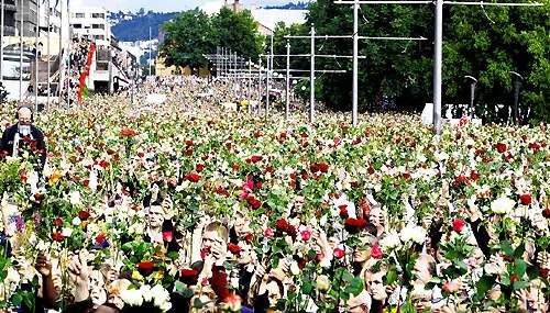 25万挪威人民在25日涌上首都奥斯陆街头,许多人手持玫瑰,悼念上周爆炸事件和枪击案的死者。