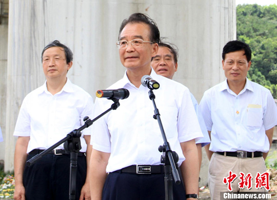 7月28日中午,国务院总理温家宝抵达“7·23”甬温线特别重大铁路交通事故现场,并与中外媒体记者见面。中新社记者 江耘 摄
