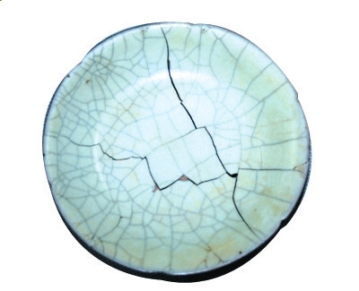 受损宋代哥窑青釉葵瓣口盘正面损毁后。