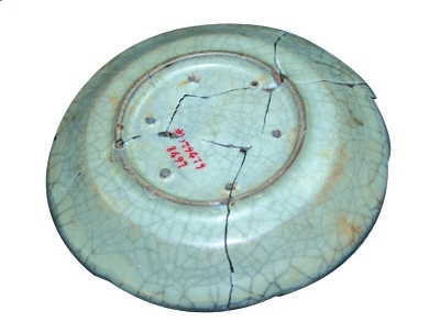 受损宋代哥窑青釉葵瓣口盘底部损毁后。