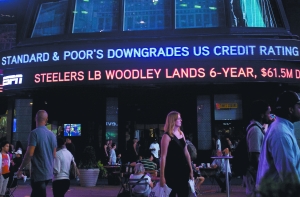 8月5日,在美国纽约时报广场,新闻电子屏上显示“标准普尔公司将美国AAA级债务评级下调至AA+”。 新华社/法新