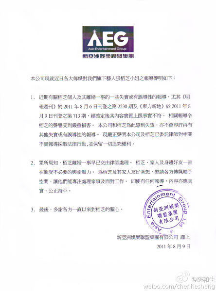 有记者致电张柏芝刚刚签约的AEG新亚洲娱乐联盟集团总裁余毓兴求证,9日,余毓兴首次公开回应,称《明报周刊》的这篇新闻毫无事实依据,纯属造谣,是一篇完完全全的假新闻。余先生同时表示,“今日我们已经通过律师楼发出了律师函。”余先生还表示,公司也将同时追究香港主持人查小欣爆料离婚事件的法律责任和之前英皇旗下杂志《东方新地》关于张柏芝不实报道的法律责任。余先生告诉记者,坚决追究上述所有杂志及相关人员的法律责任,还张柏芝一个清白。