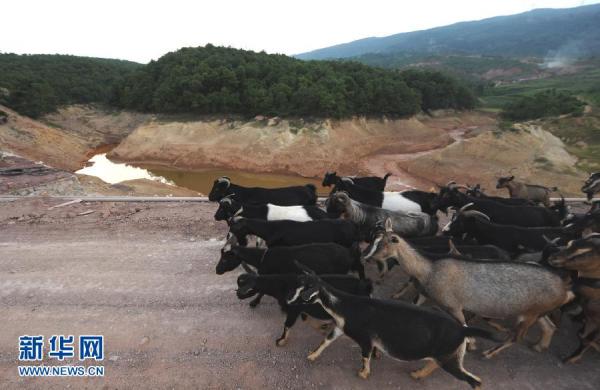 8月14日,一群山羊经过曾经被污染的叉冲水库。近日,一则“云南5000吨剧毒铬渣倒入水库,污水威胁珠江源头”的消息受到众多网民关注,该消息已成为某些论坛的头条热帖和微博热点。帖子爆料,5000吨铬渣倒入水库,事后云南曲靖将受污染水排入珠江源头南盘江。新华社“中国网事”记者赶赴曲靖,就此事进行调查核实。新华社记者 陈海宁 摄