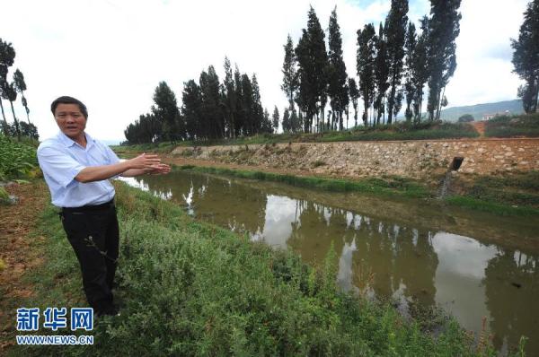 8月14日,曲靖市环保局局长在南盘江排水口察看排水情况。新华社记者 陈海宁 摄