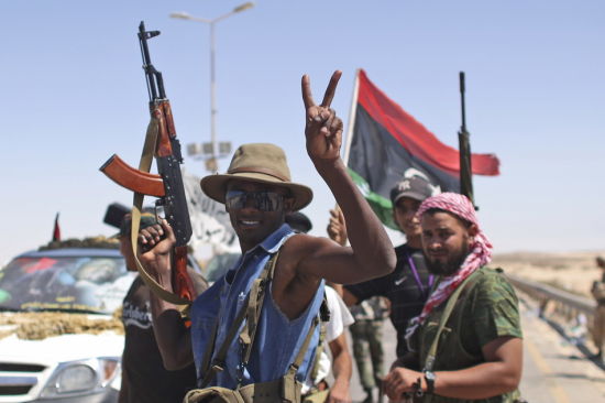 8月15日,在利比亚首都的黎波里东南大约370公里处的布雷加港,反政府武装人员打出胜利的手势。新华社/美联