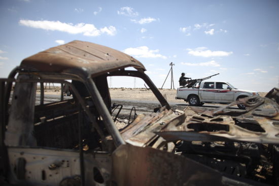反政府武装的车辆经过布雷加港一辆被毁的汽车。新华社/美联