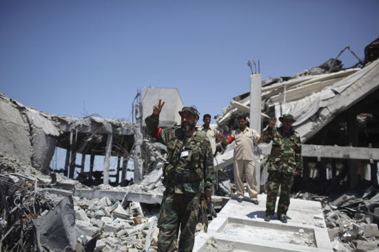 布雷加港,反政府武装人员打出胜利的手势。新华社/美联