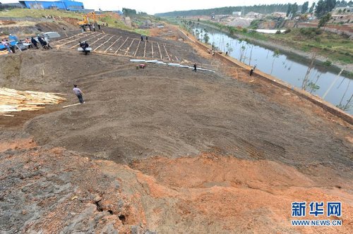 8月14日,一些工人正在清理、整治化工厂堆积在南盘江畔的铬渣山。新华社记者陈海宁摄