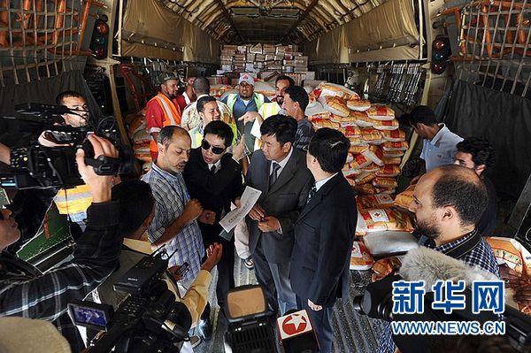 8月19日,中方与利方人员在利比亚班加西机场交接救援物资。中国红十字会向利比亚提供的首批紧急人道主义救援物资,于当地时间19日上午抵达利东部城市班加西。首批运抵物资共计90吨,包括大米、油及药品,于18日自天津滨海国际机场启运。中国红十字会计划向利比亚提供价值5000万元的紧急人道主义救援物资。下一批物资将于近日抵达利比亚首都的黎波里。新华社发(默罕默德·欧迈尔摄)