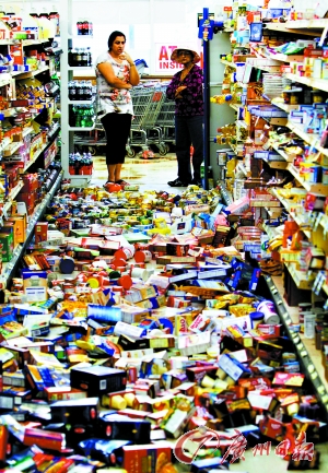 23日,美国东部一间食品杂货店的商品被震落一地。
