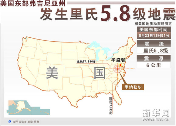 图表:美国东部弗吉尼亚州发生里氏5.8级地震 新华社记者 崔莹 编制