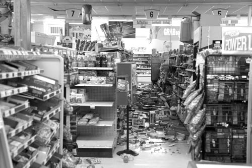 震中米纳勒尔镇,一家超市震后一片狼藉。新华社供图