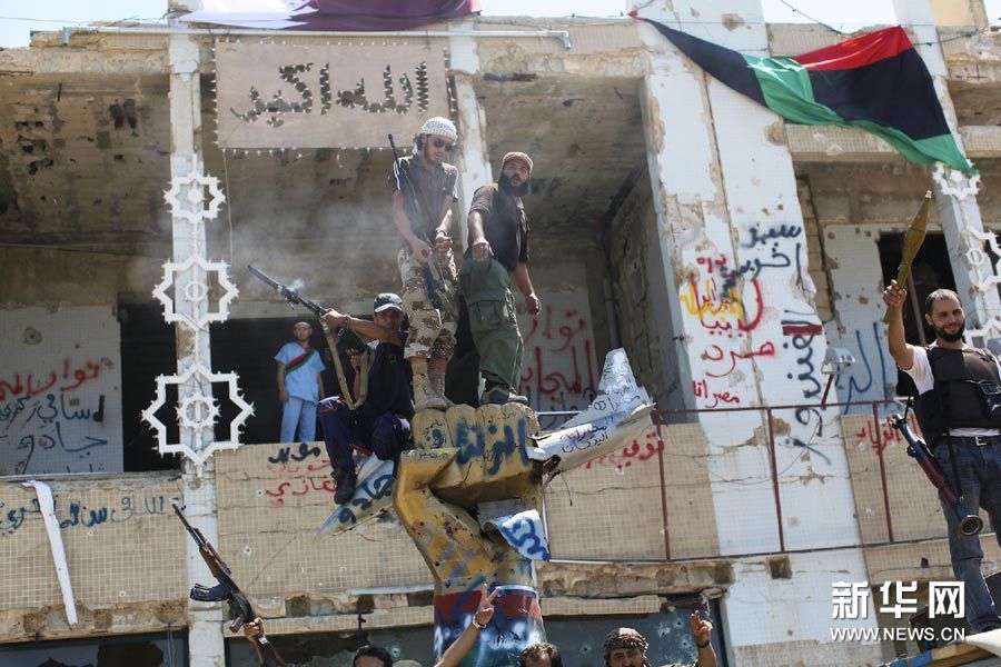 8月25日,在利比亚首都的黎波里阿齐齐亚兵营,反对派士兵在卡扎菲所立的“捏碎美国飞机”雕塑前开枪庆祝胜利。