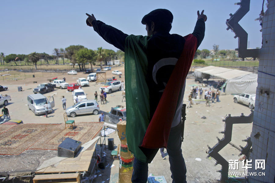 8月25日,在利比亚首都的黎波里阿齐齐亚兵营,士兵在卡扎菲以前住所的窗户欢呼。