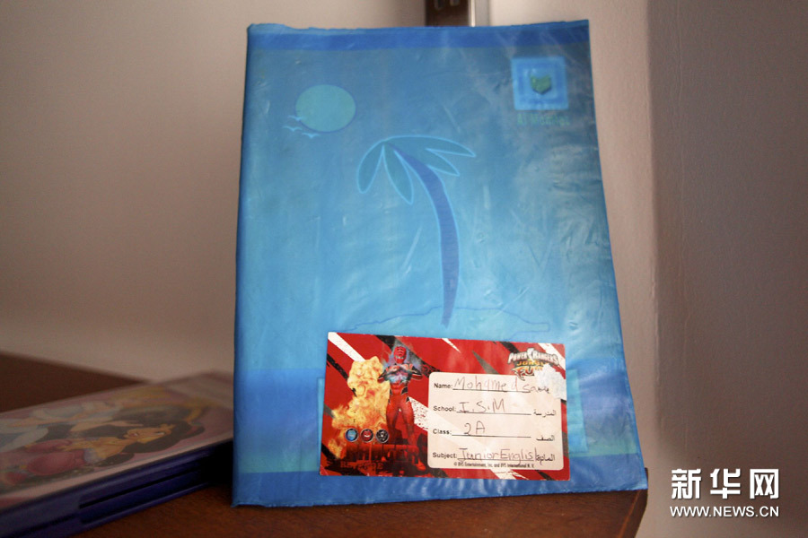 这是8月25日在利比亚首都的黎波里阿齐齐亚兵营拍摄的卡扎菲之子萨阿迪的孩子的课本。