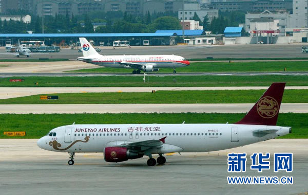 8月30日,一架吉祥航空公司的班机在上海虹桥机场滑行。 新华社发(钮一新 摄)