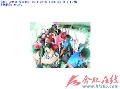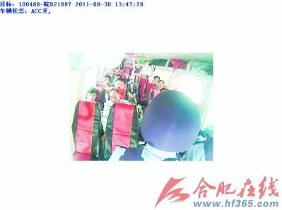 今天上午,记者在淮南市公路运输管理处GPS监控中心里,看到了事发大客车皖D21897车内摄像头拍下的部分场景。监控室陆主任说,这些图片是通过GPS卫星半小时传回监控中心,每半小时传回一张图片。记者在图片上看到,从上午8点到中午12点43分传回的图片,坐在后排大约倒数二三位身穿绿色衣服的男子表情还比较平静,整个车内人群都在昏昏欲睡。经过陆主任指认,这就是劫持人质的阳某。同时,照片还显示,这辆车还涉嫌超载,过道中还有人坐在加座的小板凳上。但随后的图片显示,车内的情况就有了变化——